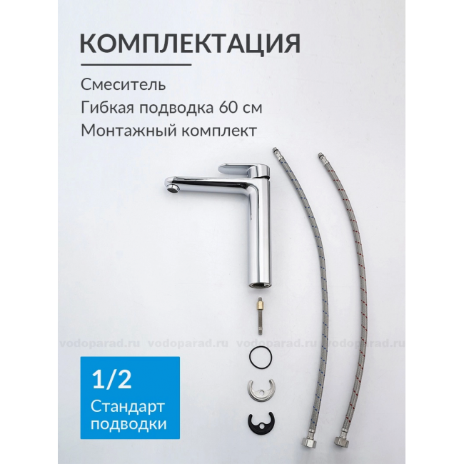 | Комплектация | 1. Смеситель 2. Гибкая подводка 60см 3. Монтажный комплект 4. Слив-перелив и донный клапан в комплект не входят |