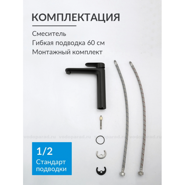 | Комплектация | 1. Смеситель 2. Гибкая подводка 60см 3. Монтажный комплект 4. Слив-перелив и донный клапан в комплект не входят |