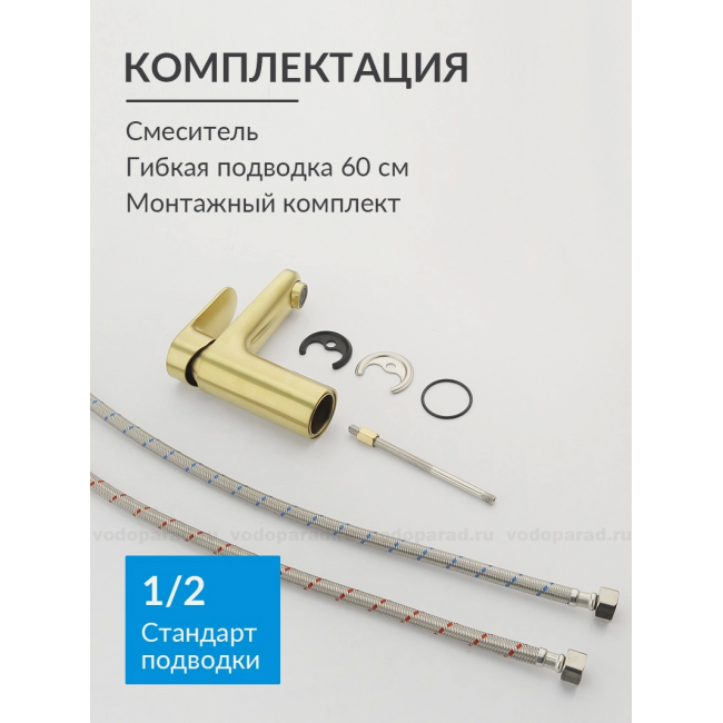 | Комплектация | 1. Смеситель 2. Гибкая подводка 60см 3. Монтажный комплект 4. Слив-перелив и донный клапан в комплект не входят |