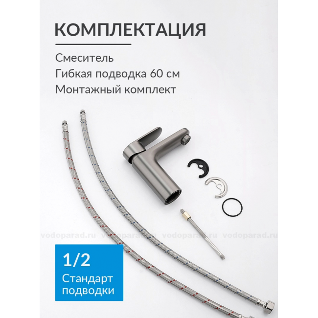 | Комплектация | 1. Смеситель 2. Гибкая подводка 60см 3. Монтажный комплект 4. Слив-перелив и донный клапан в комплект не входят |