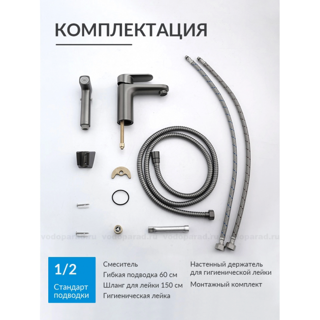 | Комплектация | 1. Смеситель 2. Гибкая подводка 60см 3. Шланг для лейки 150 см 4. Гигиеническая лейка, оснащена нажимным механизмом для остановки потока воды 5. Настенный держатель для гигиенической лейки 6. Монтажный комплект |