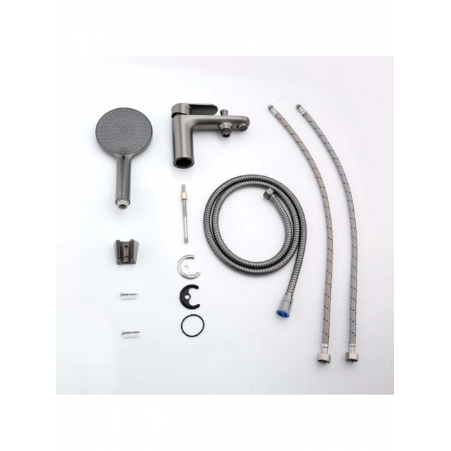 | Комплектация | 1. Смеситель 2. Гибкая подводка 60см 3. Шланг для лейки 150 см 4. Лейка ручного душа 5. Настенный держатель для ручной лейки |