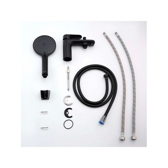 | Комплектация | 1. Смеситель 2. Гибкая подводка 60см 3. Шланг для лейки 150 см 4. Лейка ручного душа 5. Настенный держатель для ручной лейки |
