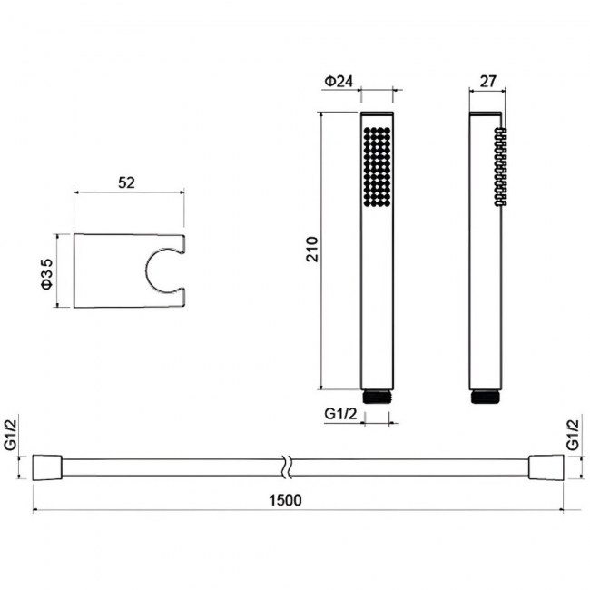 | Комплектация | 1. Держатель для душа 2. Душевой шланг из ПВХ 150 см 3. Душевая лейка |