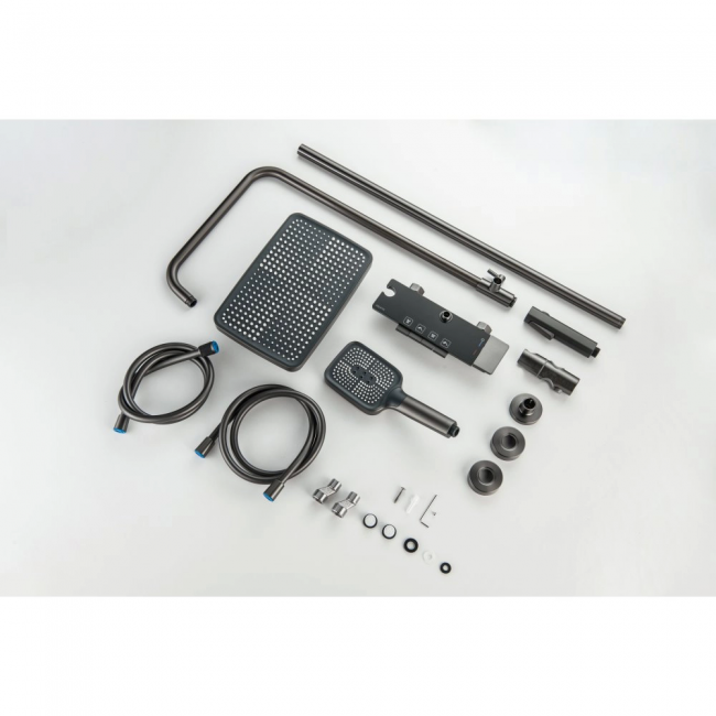 | Комплектация | 1. Тропический душ 2. Душевая лейка 3. Рейлинг 4. Душевой шланг из ПВХ 5. Смеситель 6. Излив 7. Гигиеническая лейка 8. Шланг гигиенической лейки из ПВЗ 9. S-образные эксцентрики 10. Декоративные отражатели 11. Монтажный комплект |