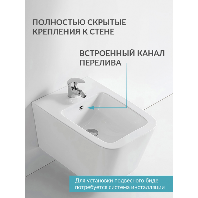 - Донный клапан в комплект не входит и приобретается отдельно. Для установки подвесного биде потребуется система инсталляции.