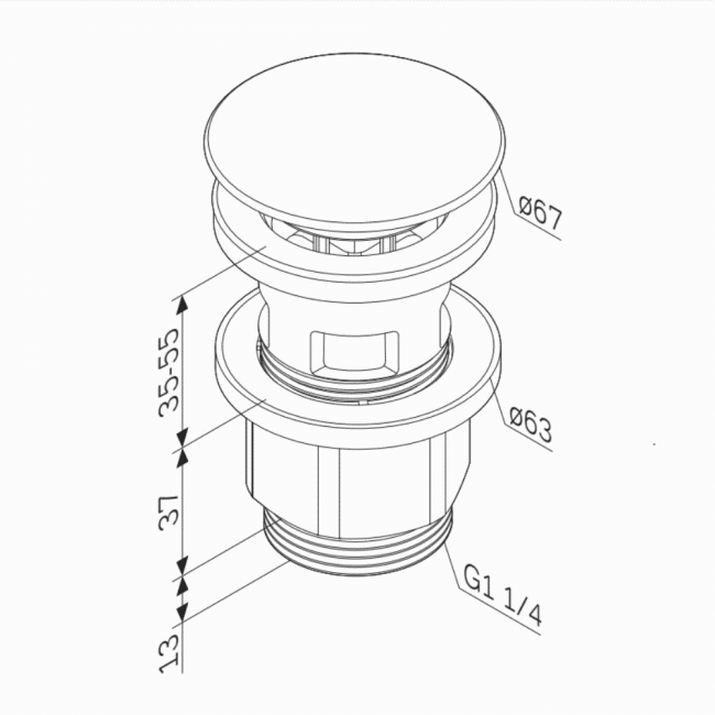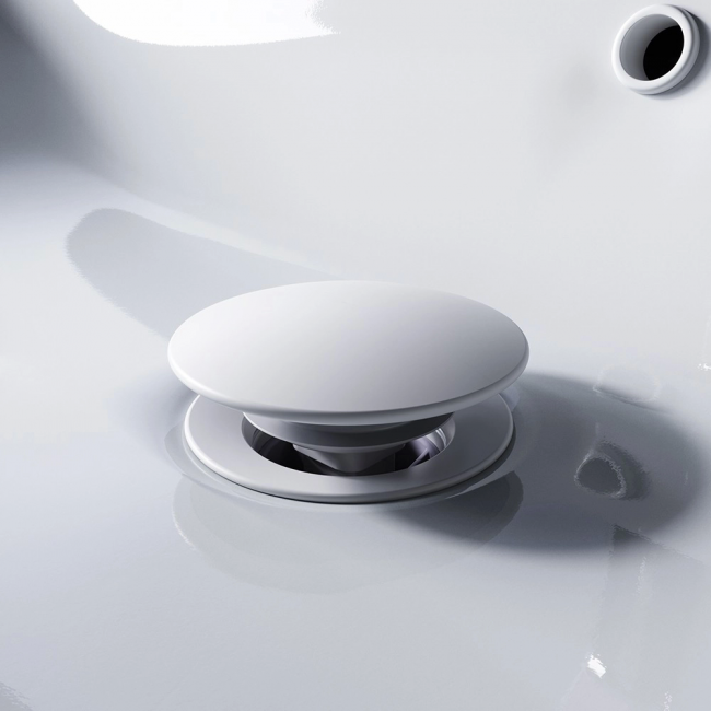 С отверстием для подключения перелива позволяющего выпускать воду из раковины при ее переполнении через отверстие в нижней части перелива. Система клик-клак управляется нажатием на пробку слива. Покрытие устойчиво к коррозии появлению царапин сколов и потускнению. Круглая заглушка белого цвета. Подключение к сифону: G1 1/4"