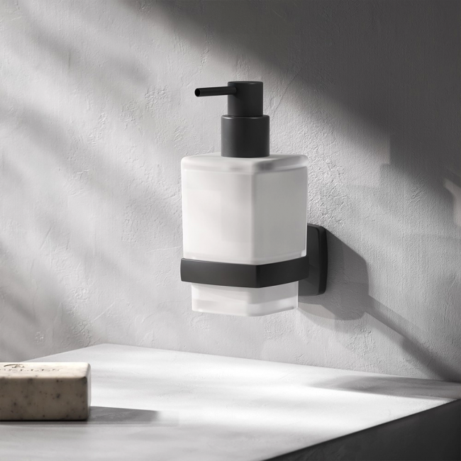 Дерзкая и стильная коллекция Gem в черном цвете превращает даже простые аксессуары для ванной комнаты в классные дизайнерские детали которыми хочется пользоваться каждый день. Форма аксессуаров Gem повторяет линии смесителей коллекции подчеркивая единую концепцию дизайна. Диспенсер для мыла изготовлен из цинка и закаленного матового стекла. Лазерная обработка стыков гарантирует ультратонкий шов и 100% защиту от влаги. Матовая поверхность предотвращает появление следов от капель воды сохраняя поверхность чистой на много дольше.