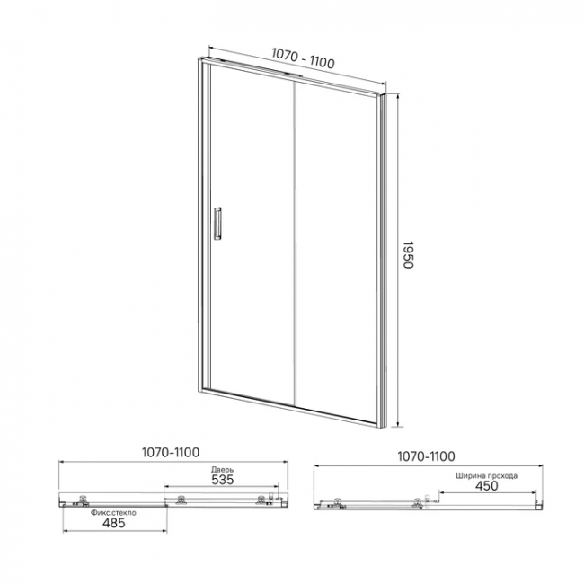 | Оснащение | алюминиевый профиль, закаленное стекло, ролики, ручка из сплава металлов, силиконовые уплотнители, сливная арматура |