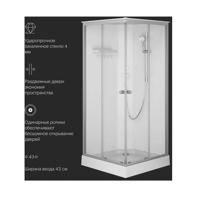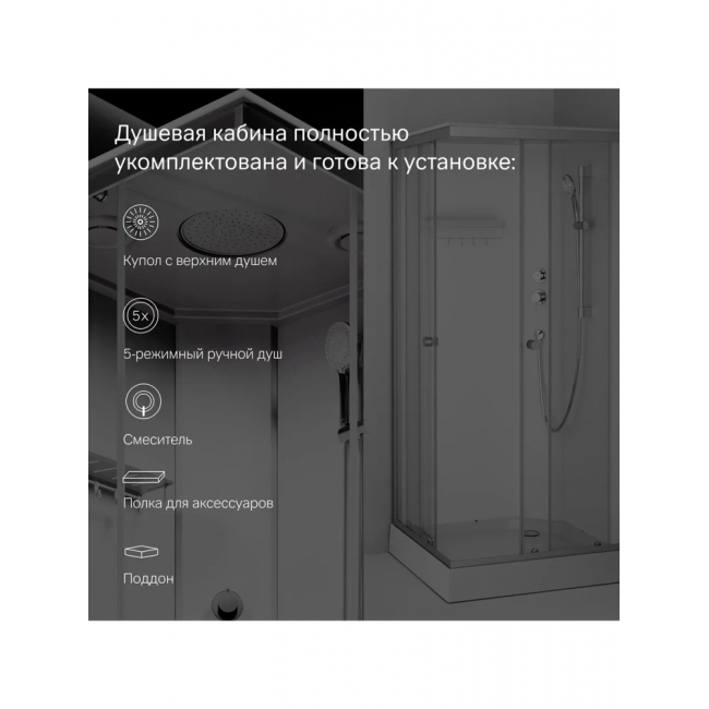 кабина оснащена 5-режимным ручным душем, стильным смесителем, тропическим душем;
