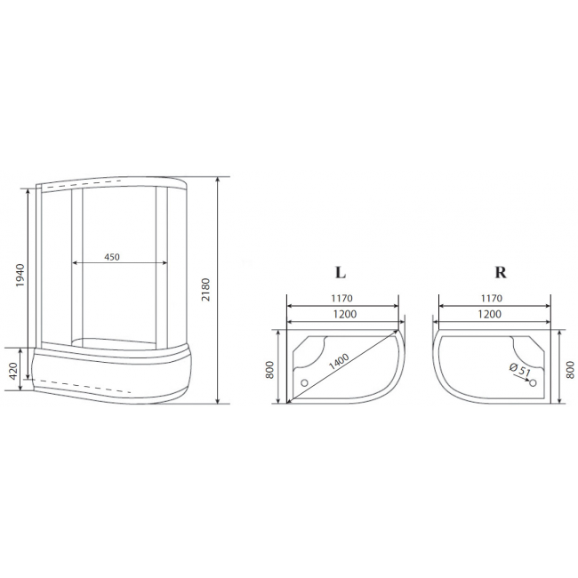акриловый поддон высотой: 42 см, на металлическом каркасе с регулируемыми по высоте ножками;