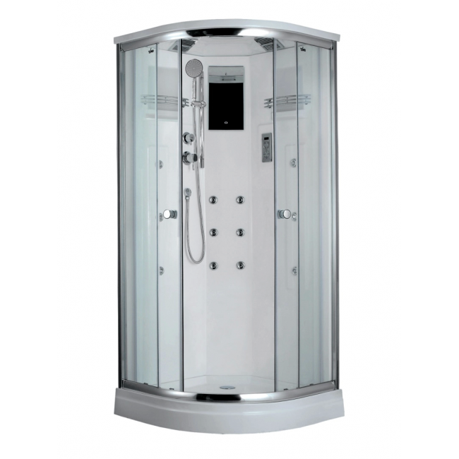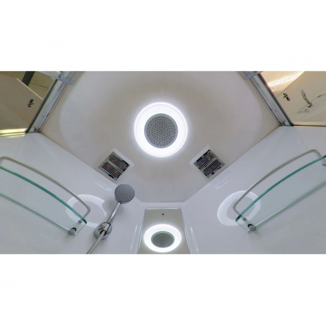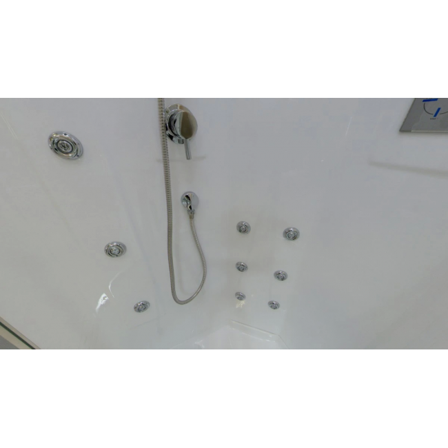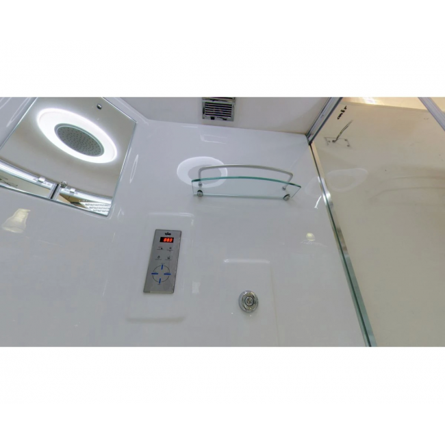 Удобство пользователю обеспечивает невысокий поддон и достаточно широкий проем входа. Полностенное ограждение из закаленного стекла гарантирует устойчивость всей конструкции. В комплект входит зеркало, смеситель, душевая лейка и полки для душевых принадлежностей. Укрепить здоровье пользователя поможет гидромассаж.