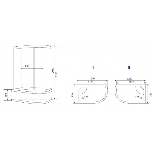 акриловый поддон (не ABS) h-48 см с усиленным каркасом,
