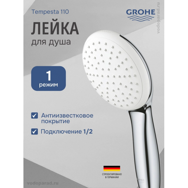 Душевая лейка Grohe Tempesta 110 1jet 27852003 хром купить с доставкой. 100% Оригинал. Гарантия!