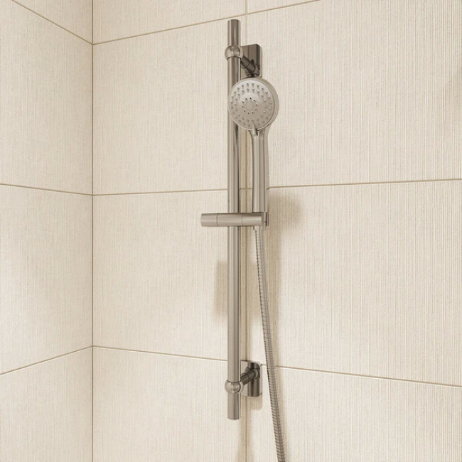 Стойка для душа, хром, нержавеющая сталь с никель-хромовым покрытием, высота 700 мм, диаметр 22 мм. Оба крепления свободные. Держатель лейки из ABS-пластика, поворотное крепление, регулировка наклона лейки. Крепеж в комплекте.