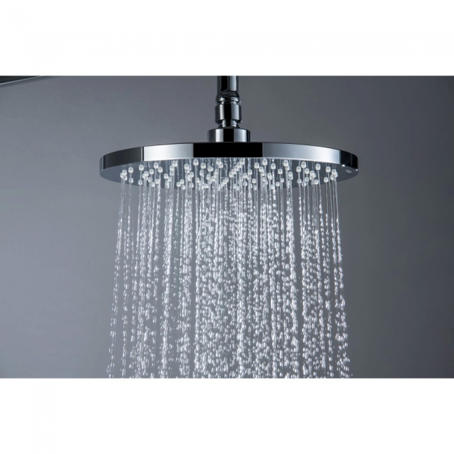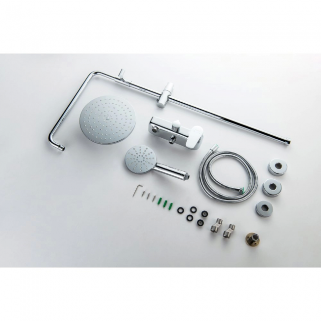 | Комплектация | 1. Тропический душ 2. Душевая лейка 3. Рейлинг 4. Душевой шланг из нержавеющей стали 5. Смеситель 6. Излив 7. S-образные эксцентрики 8. Декоративные отражатели 9. Монтажный комплект |