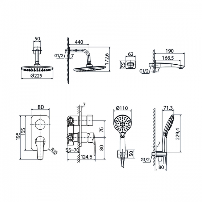 | Размер верхнего душа, мм | 225 |