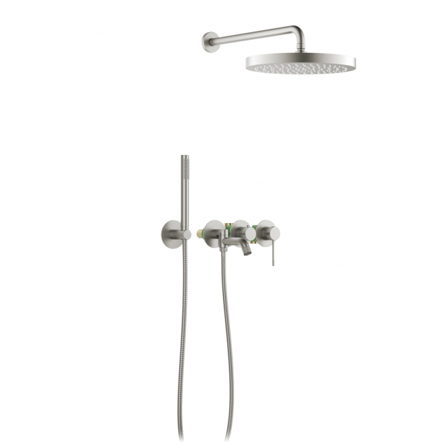 Цвет "матовый никель" является новым фаворитом для многих дизайнеров интерьеров. Этот цвет универсален, подходит практически для любой ванной комнаты и понравится всем, кто желает немного "мягкости" в дизайне ванной.Встраиваемая душевая система Saona 2348 предназначена для монтажа в полой или твердой стене. Основные преимущества встроенной системы: коммуникации, крепления и механизмы спрятаны в стену и видны только декоративные элементы. Установить встроенную систему можно в любом месте. Использовать такой смеситель очень удобно, регулировка температуры и напора воды осуществляется одним рычагом. Регулируя напор воды в режиме "тропический душ", можно получить массажное воздействие различной интенсивности. Переключение режимов подачи воды (тропический душ, излив) осуществляется поворотом керамического дивертора. Для подачи воды в режим "ручной душ" - поверните излив к стене. Сложностей монтажа не возникает при установке элементов душевой системы опытным сантехником. Внимательно изучите инструкцию по монтажу и эксплуатации.Цвет "матовый никель" прост в уходе, не оставляет отпечатков пальцев и разводы от воды.