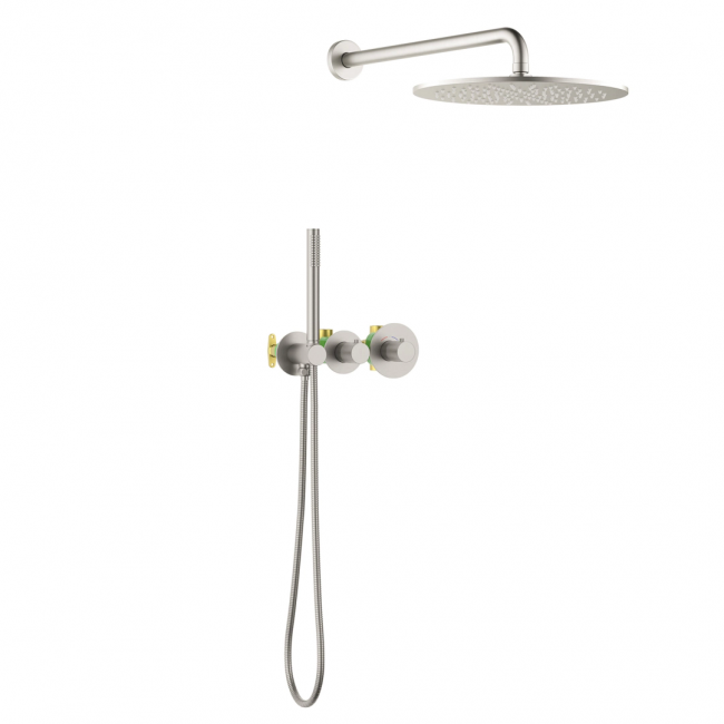 Цвет "матовый никель" является новым фаворитом для многих дизайнеров интерьеров. Этот цвет универсален, подходит практически для любой ванной комнаты и понравится всем, кто желает немного "мягкости" в дизайне ванной.Встраиваемая душевая система с термостатом Timo Saona 2359 относится к премиальному сегменту, предназначена для монтажа в полой или твердой стене. Термостатический картридж поддерживает стабильную температуру воды, обеспечивая максимально комфортные условия для принятия водных процедур. Верхний душ создает имитацию проливного дождя, вода обливает человека целиком. Регулируя напор воды можно получить массажное воздействие, что очень полезно для здоровья. Основные преимущества встроенной системы: элегантный внешний вид, все коммуникации и крепления спрятаны в стену и потолок, снаружи видны только декоративные элементы. Установить встроенную систему можно в любом месте. Сложностей монтажа не возникает при установке элементов душевой системы опытным сантехником. Внимательно изучите инструкцию по монтажу и эксплуатации.Цвет "матовый никель" прост в уходе, не оставляет отпечатков пальцев и разводы от воды.
