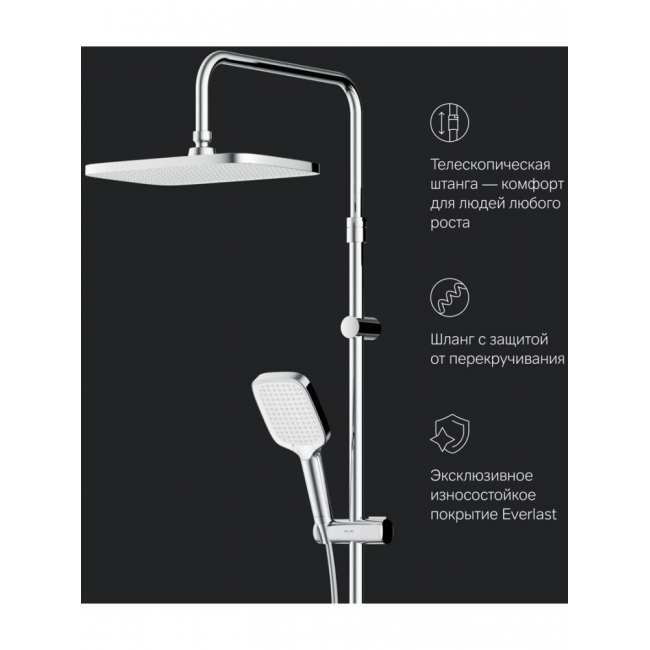 Телескопическая штанга регулируется по высоте в диапазоне от 1030 до 1460 мм обеспечивая комфорт для людей любого роста. А трендовая прямоугольная форма и увеличенный размер тропического душа подарят вам ощущения настоящего домашнего SPA.