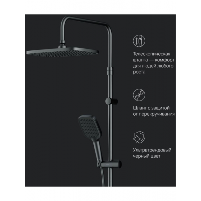 Телескопическая штанга регулируется по высоте в диапазоне от 1030 до 1460 мм обеспечивая комфорт для людей любого роста. А трендовая прямоугольная форма и увеличенный размер тропического душа подарят вам ощущения настоящего домашнего SPA.