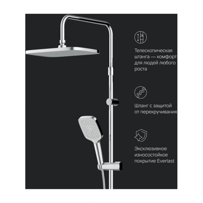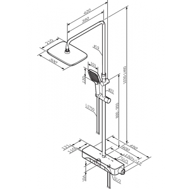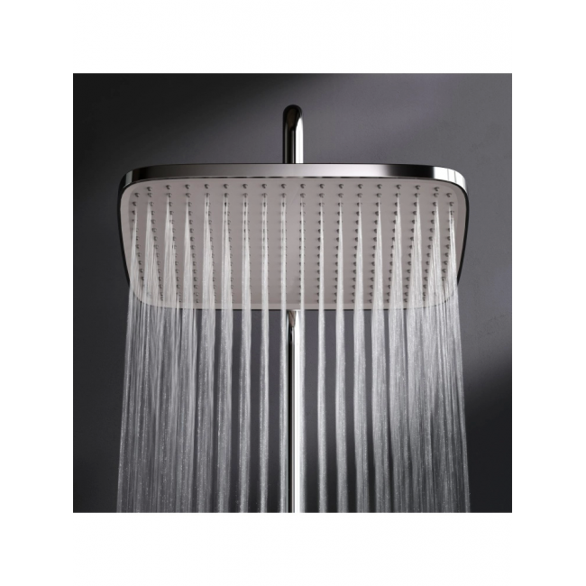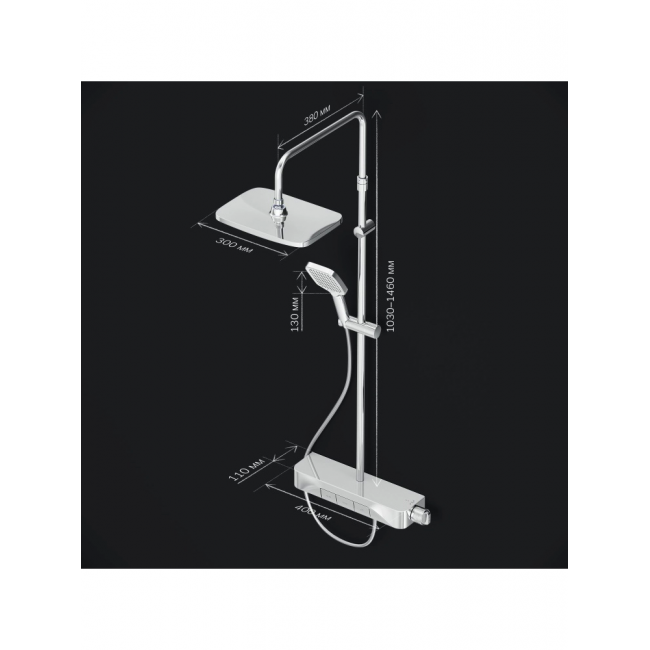В комплектацию душевой системы входят: тропический душ, ручной душ, смеситель-полочка с термостатом и изливом, эксцентрики, держатели штанги и душа. Длина душевой штанги - 1030-1460 мм. Длина душевого шланга - 1750 мм. Размер ручного душа - 130х103 мм. Диаметр верхнего душа - 300х210 мм.
