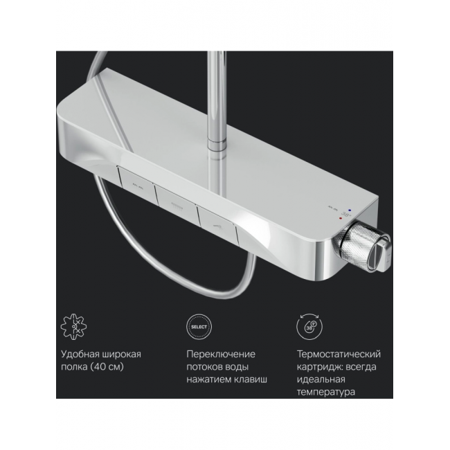специально спроектированная эргономичная ручка позволяет вам управлять душевой системой даже с мыльными руками (переключение потоков воды осуществляется нажатием клавиши);