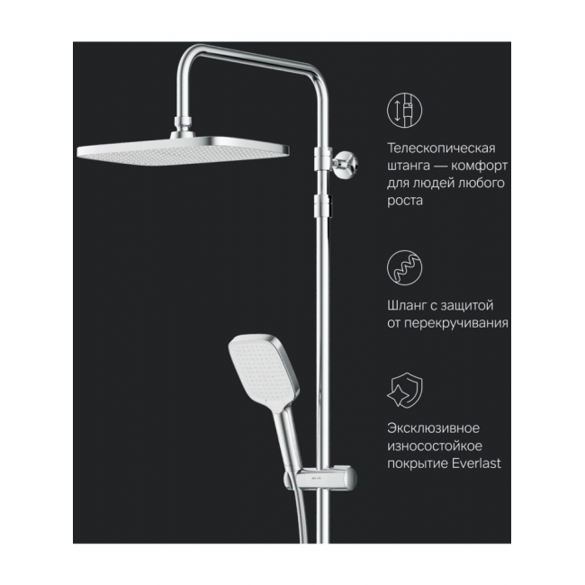 Продуманные детали для вашего удобства: телескопическая штанга регулируется по высоте обеспечивая комфорт для людей любого роста. Прямоугольная форма увеличенный размер леек и 3 режима ручного душа подарят вам ощущения настоящего домашнего SPA.