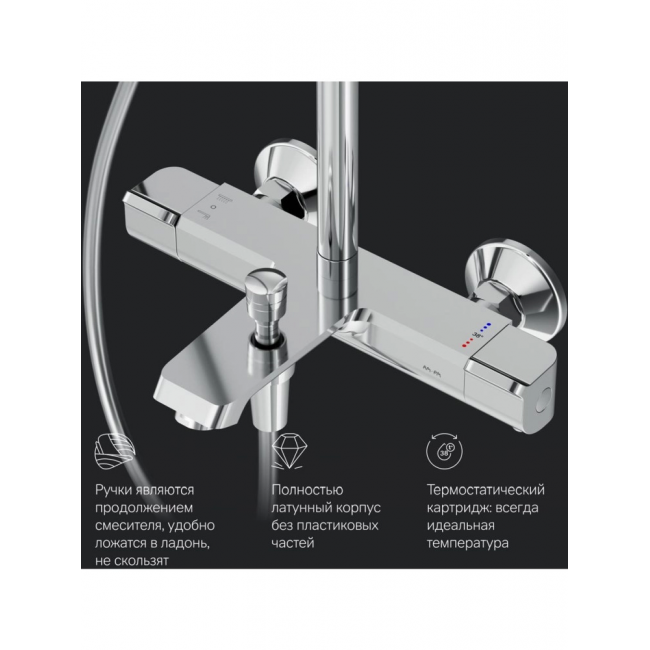 Смеситель для душа с термостатом: термостатический картридж с высокочувствительным термоэлементом и стопором безопасности на 38 градусах надежно защитит вас от ожога даже при внезапном отключении холодной воды.