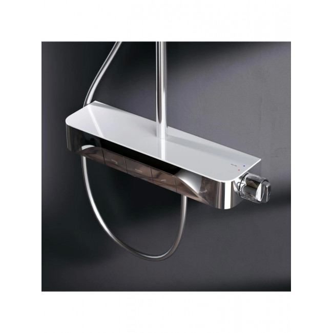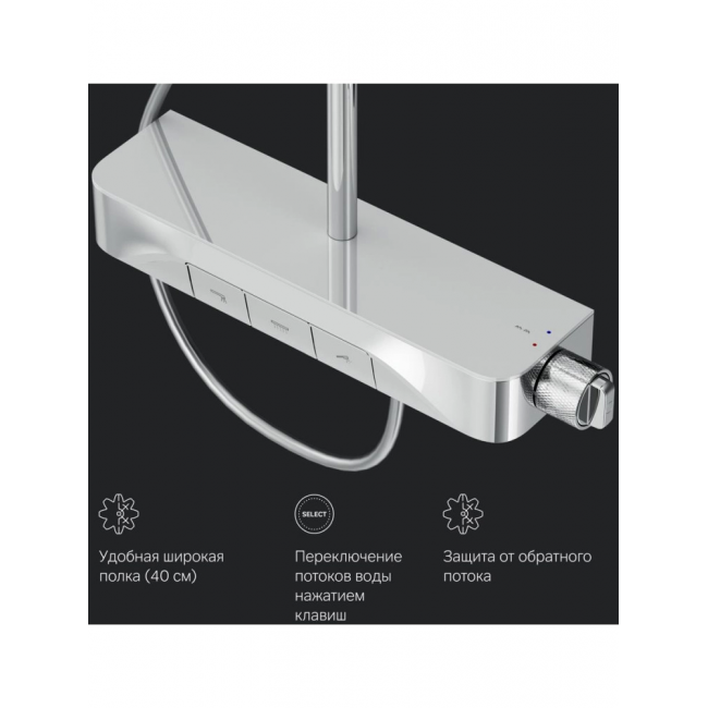 Интуитивно понятное управление: всего одна удобная ручка для настройки температуры и потока воды. Ручка дополнена инновационным антискользящим покрытием которое позволяет комфортно управлять душевой системой даже с мыльными руками. Переключение потоков воды осуществляется нажатием клавиши.