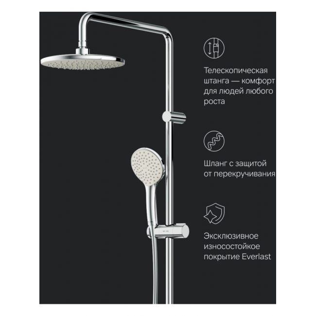 поворотная и телескопическая душевая штанга позволяет индивидуально настроить расположение верхнего душа;
