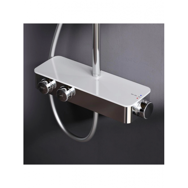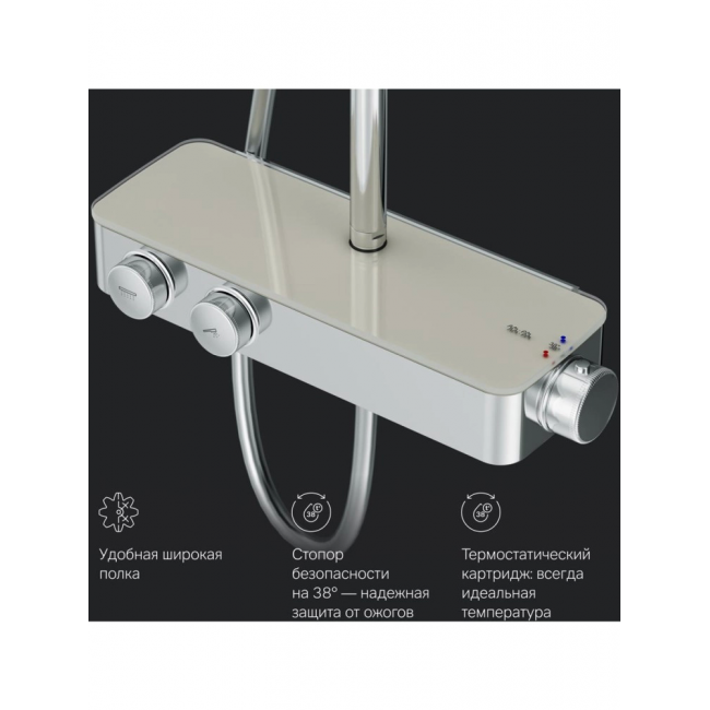 Верхняя часть смесителя выполнена из глянцевого стекла и является интегрированной полочкой для нужных мелочей при приёме душа