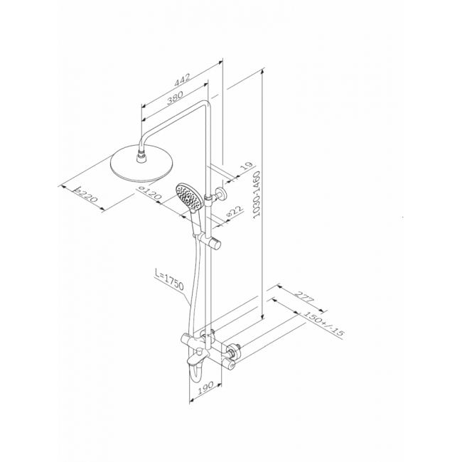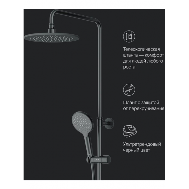 Продуманные детали для удобства использования: штанга регулируется по высоте в диапазоне от 1030 до 1460 мм обеспечивая комфорт для людей любого роста шаровый шарнир в держателе верхнего душа позволяет регулировать угол его наклона душевой шланг 1750 мм верхний душ диаметром 220 мм ручной душ диаметром 120 мм.