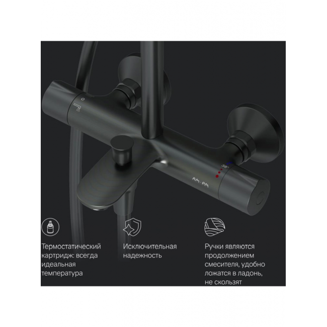 Смеситель для ванны и душа с термостатом: термостатический картридж с высокочувствительным термоэлементом стопором безопасности на 38 градусов быстрой реакцией на изменения температуры или давления надежно защищает от ожога даже при внезапном отключении холодной воды.