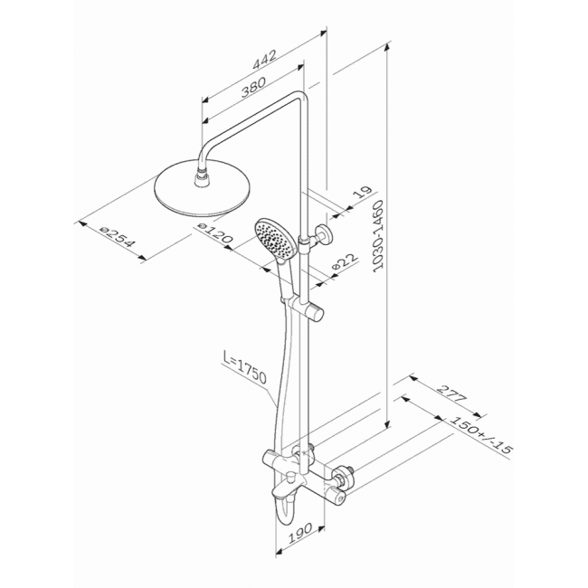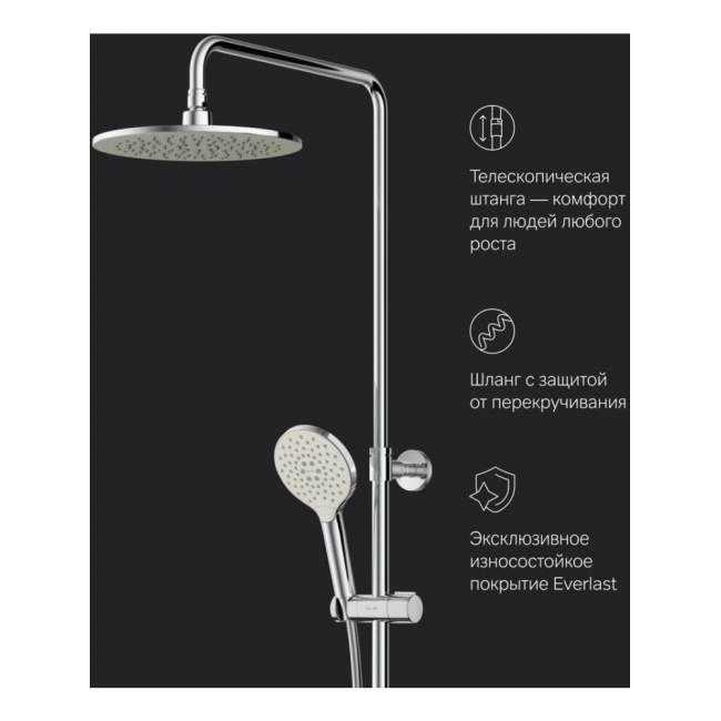 Продуманные детали для удобства использования: штанга регулируется по высоте в диапазоне от 1030 до 1460 мм обеспечивая комфорт для людей любого роста шаровый шарнир в держателе верхнего душа позволяет регулировать угол его наклона душевой шланг 1750 мм верхний душ диаметром 250 мм ручной душ диаметром 120 мм.