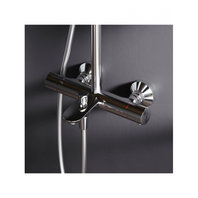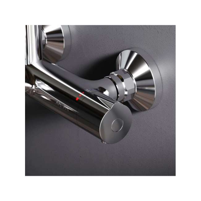 Смеситель для ванны и душа с термостатом: термостатический картридж с высокочувствительным термоэлементом стопором безопасности на 38 градусов быстрой реакцией на изменения температуры или давления надежно защищает от ожога даже при внезапном отключении холодной воды.