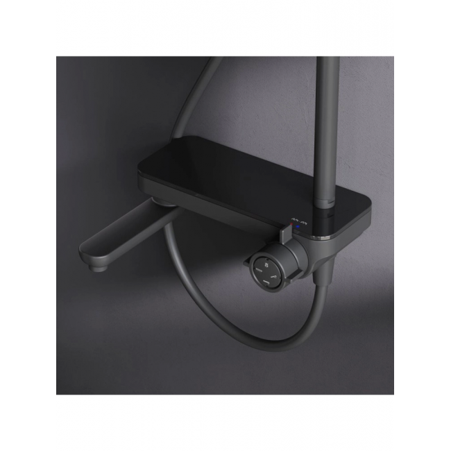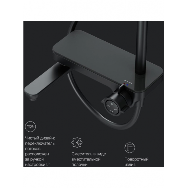 Смеситель выполнен в виде полочки. Чистый дизайн без лишних деталей: переключатель расположен за ручкой настройки температуры и позволяет менять источник потока воды от ручной лейки и излива до верхнего душа.