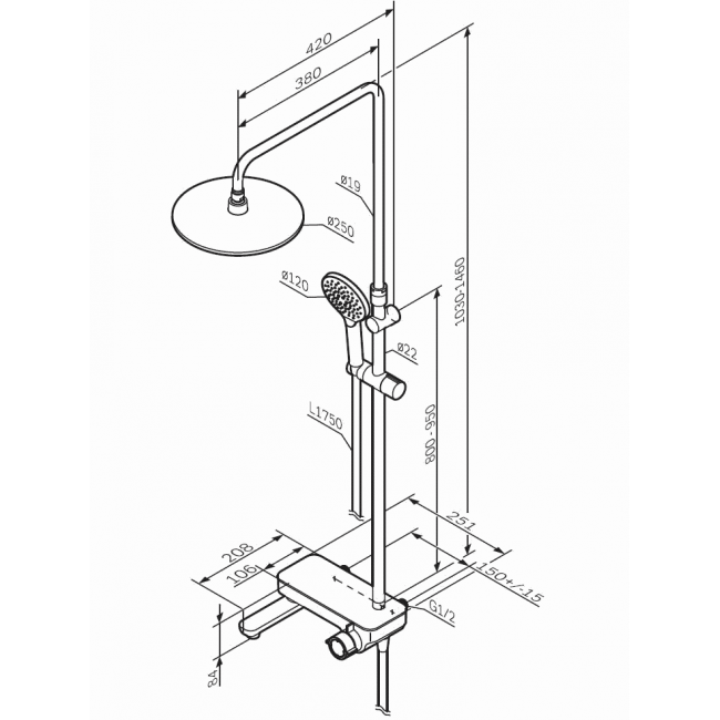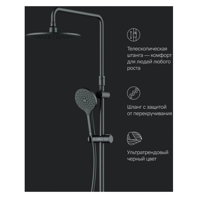 Премиальные размеры и продуманные детали: увеличенный диаметр душевых леек (верхний душ 220 мм и ручной душ 120 мм) позволит ощутить преимущества тропического душа тогда как увеличенная длина шланга 1750 мм обеспечит свободу движений во время принятия душа. Телескопическая поворотная штанга регулируется по высоте в диапазоне от 1030 до 1460 мм обеспечивая комфорт для людей любого роста а шаровой шарнир в держателе верхнего душа позволяет регулировать угол его наклона.