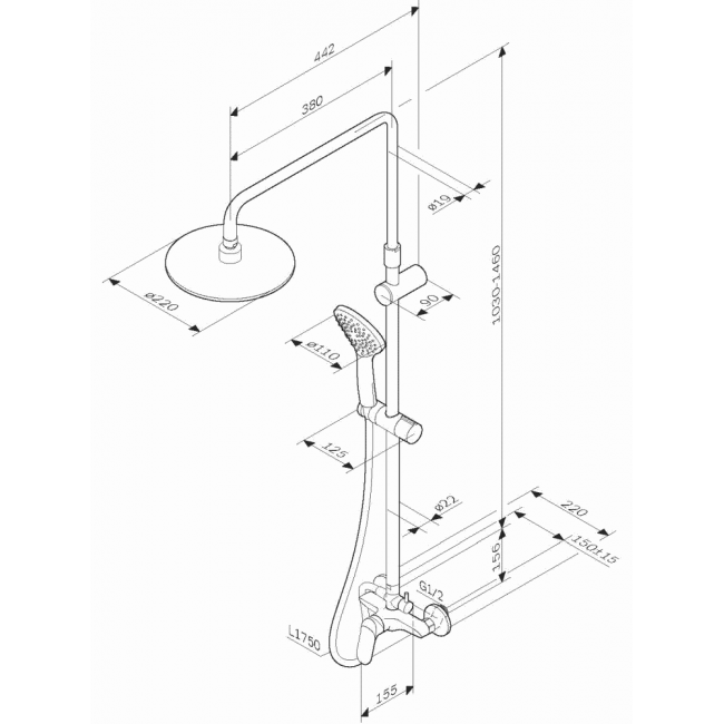 Диаметр душевых леек (верхний душ 220 мм и ручной душ 110 мм) позволит ощутить преимущества тропического душа даже в стандартной ванной тогда как увеличенная длина шланга 1750 мм обеспечит свободу движений во время принятия душа. Продуманные детали для удобства использования: телескопическая поворотная штанга регулируется по высоте в диапазоне от 1030 до 1460 мм обеспечивая комфорт для людей любого роста.