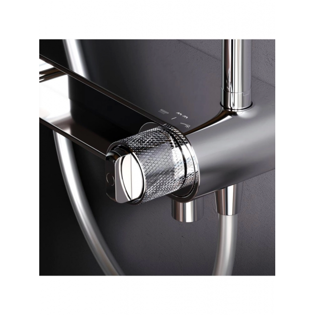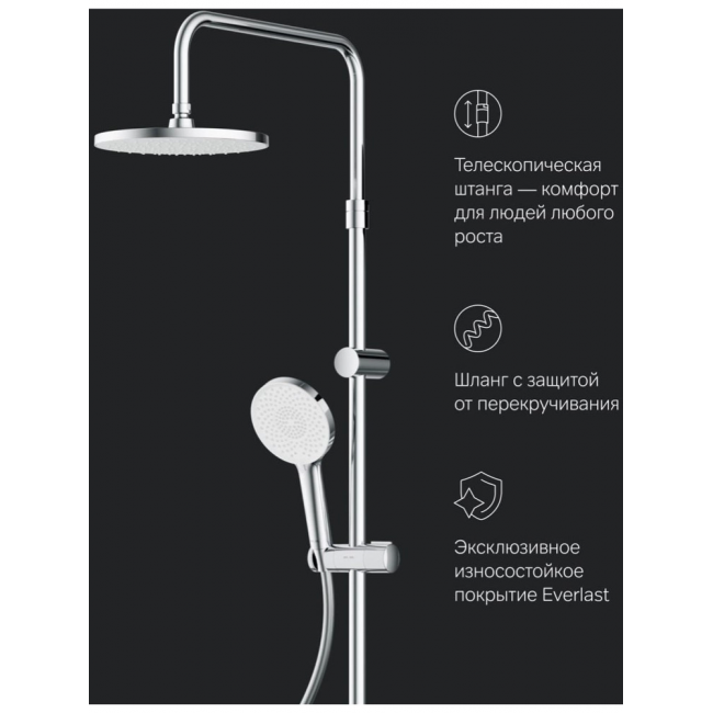 Телескопическая штанга с диапазоном регулировки 400 мм сделает процесс принятия душа удобным для людей любого роста. А благодаря увеличенным размерам тропического (220 мм) и ручного (120 мм) душей вы ощутите все преимущества использования дизайнерского продукта.