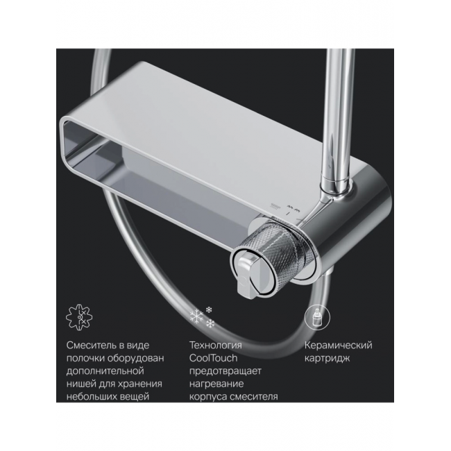 Смеситель в виде полочки оборудован дополнительной нишей. Это идеальное решение для современной ванной комнаты где самые необходимые вещи всегда находятся под рукой.