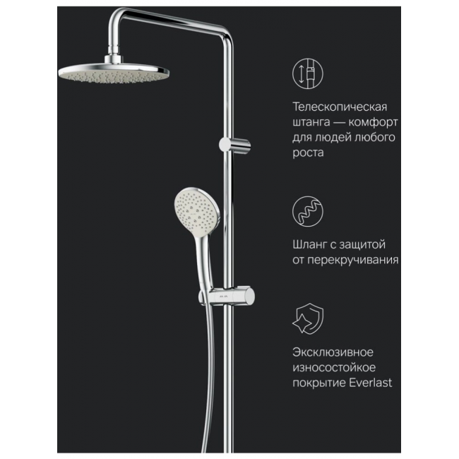 Продуманные детали душевой системы для удобства использования: штанга регулируется по высоте в диапазоне от 1 030 до 1 460 мм обеспечивая комфорт для людей любого роста шаровый шарнир в держателе верхнего душа позволяет регулировать угол его наклона душевой шланг 1750 мм верхний душ диаметром 220 мм ручной душ диаметром 110 мм.
