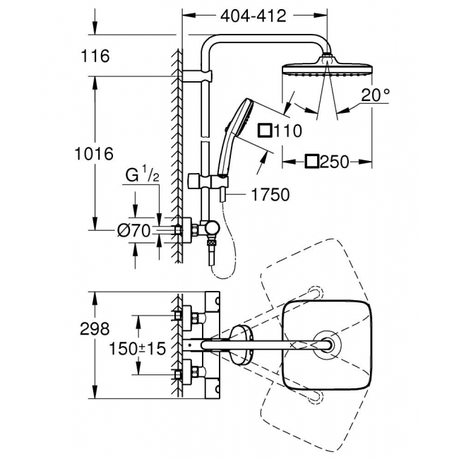 | Размер верхнего душа, мм | 250 |