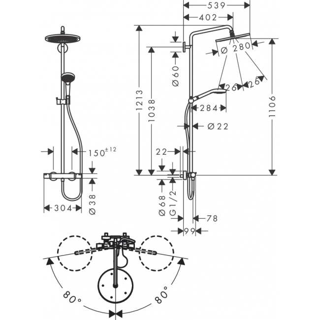 - состоит из: верхний душ, ручной душ, термостат для душа, штанга для душа, держатель для душа, душевая штанга