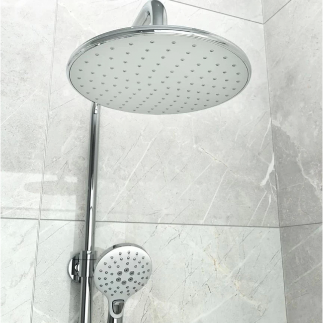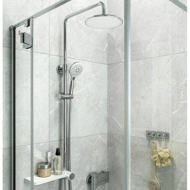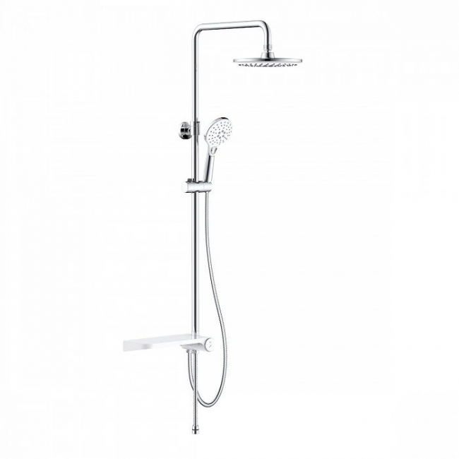 Душевой гарнитур с верхней лейкой. Белая полка и белые лейки. Стойка из нержавеющей стали диаметром 24 мм. Телескопическая стойка, высота 800-1100 мм. Ручная лейка с 3 режимами (Rain, Massage, Rain&Massage), кнопочное переключение режимов, цвет белый с хромом, диаметр 110 мм. Верхняя лейка белая с хромом, 1 режим, диаметр 220 мм, шарнирное крепление. Белая полка из ABS-пластика с кнопочным дивертором. Два шланга ПВХ в оплетке из нержавеющей стали: 1,5 м и 0,5 метра. В комплекте: крепеж.
