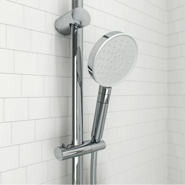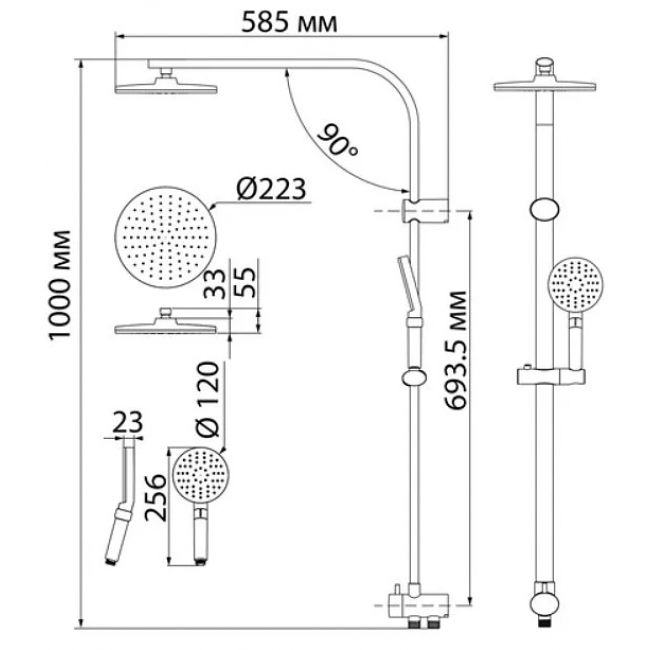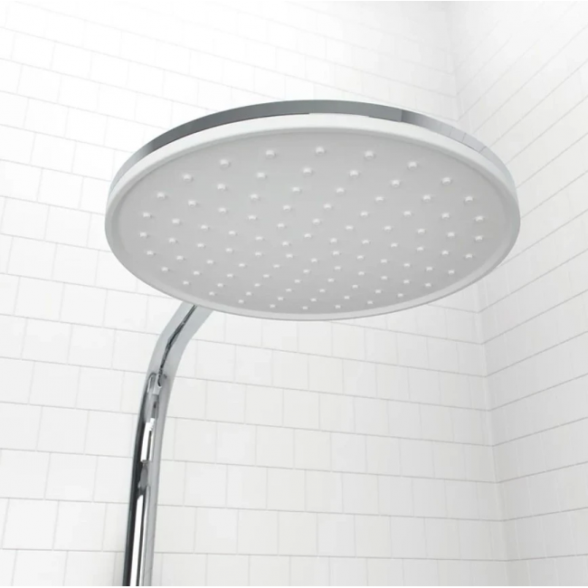 Душевой гарнитур с верхней лейкой. Стойка из нержавеющей стали с никель-хромовым покрытием, высота стойки 970 мм. Материал корпуса дивертора - ABS-пластик. Шланг для душа из ПВХ, 1,5 м и 0,6 метра, цвет серебряный, с системой от перекручивания Twist Free. Верхняя лейка из ABS-пластика, диаметр 225 мм, хром/белый матовый. Ручная лейка из ABS-пластика, диаметр 120 мм, хром/белый матовый, 3 режима (Rain, Massage, Rain&Massage), переключение на ручке с помощью слайдера. В комплекте: крепеж.