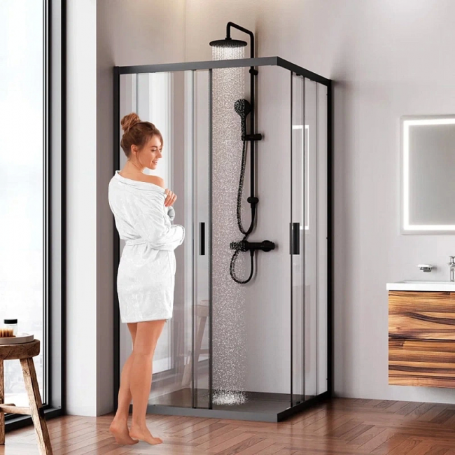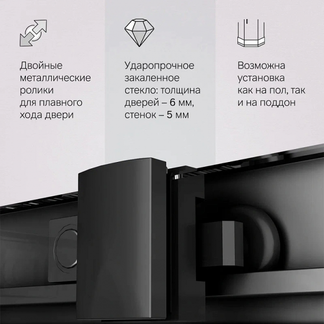 Душевое ограждение выполнено из ударопрочного закаленного стекла. Толщина фиксированного стекла 5 мм толщина стекла двери 6 мм. Профили ограждения изготовлены из надежного алюминия с премиальным анодированным покрытием. Анодирование обеспечивает равномерный насыщенный цвет и особенную стойкость к механическим повреждениям.