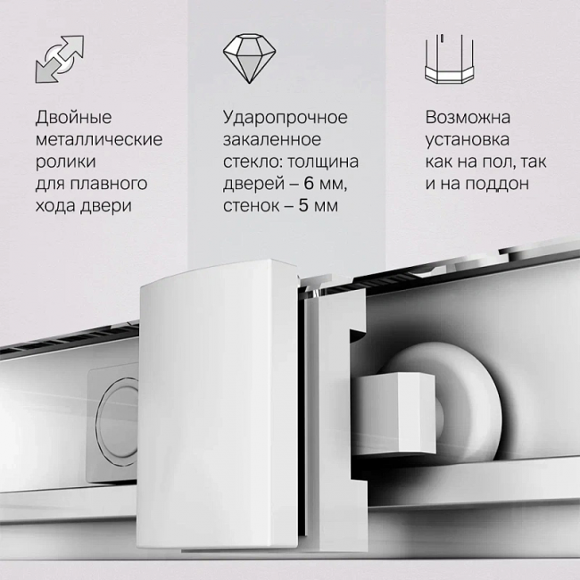 Каждая деталь соответствует высоким требованиям к качеству и эргономике. Надежные двойные металлические ролики обеспечивают плавный и бесшумный ход дверей. Нижние ролики обладают функцией быстрого снятия облегчая процесс уборки.