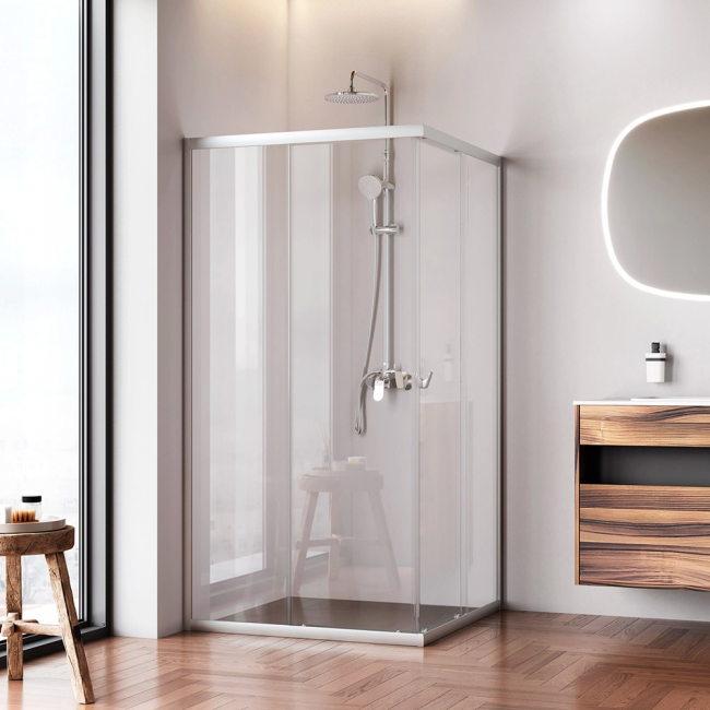 Ограждение имеет сверхпрочные закаленные стёкла. Толщина фиксированных стекол составляет 4 мм двери имеют увеличенную толщину 5 мм. Невероятно плавное и легкое открывание двери благодаря двойным усиленным роликам из ABS-пластика. Нижние ролики обладают функцией быстрого снятия для самой лёгкой уборки. Магнитные уплотнители дверей делают ограждение полностью герметичным и предотвращают попадание воды за пределы душевой зоны.