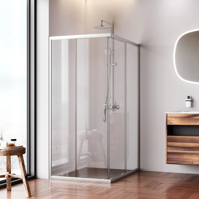 Ограждение имеет сверхпрочные закаленные стёкла. Толщина фиксированных стекол составляет 4 мм двери имеют увеличенную толщину 5 мм. Невероятно плавное и легкое открывание двери благодаря двойным усиленным роликам из ABS-пластика. Нижние ролики обладают функцией быстрого снятия для самой лёгкой уборки. Магнитные уплотнители дверей делают ограждение полностью герметичным и предотвращают попадание воды за пределы душевой зоны.